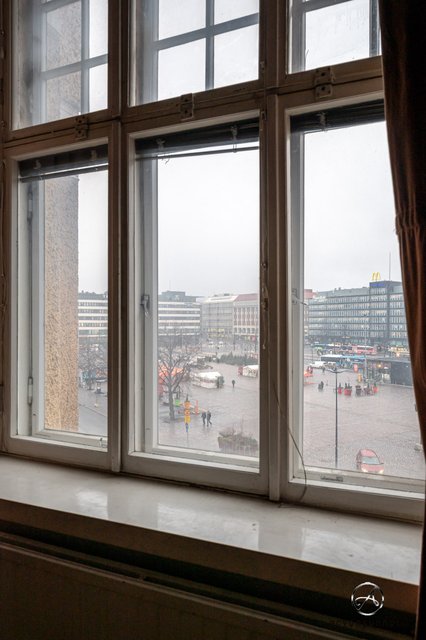 Ikkunoista avautuu näkymä torille. Kaupunki on koko ajan läsnä, mutta sisällä on rauhallista. Huonekorkeus, vanhat puulattiat ja kaakeliuunit tuovat arvokkuutta, joka tuntuu heti – ja joka kantaa pintojen ohi.