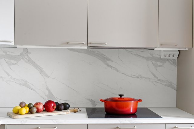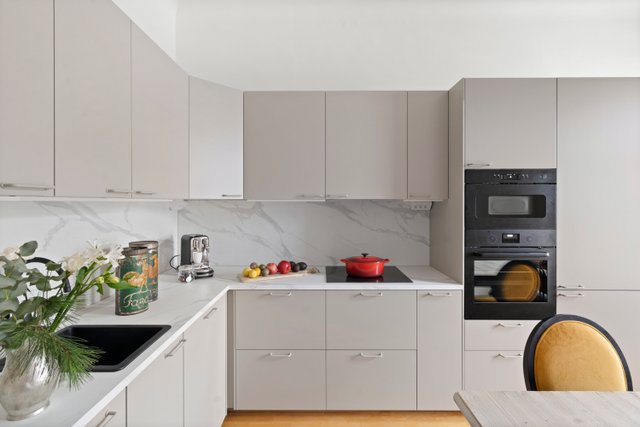 - Juuri remontoidussa keittiössä integroidut kodinkoneet; jääkaappi-pakastin, astianpesukone, induktioliesi, erillisuuni ja mikroaaltouuni.
