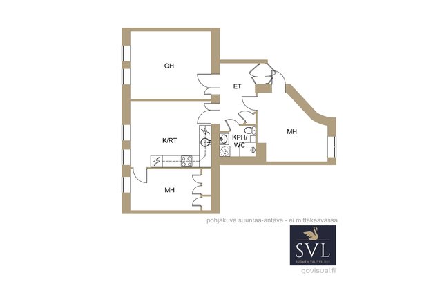 Asunnossa on kaksi makuuhuonetta, olohuone ja keittiö erinomaisella pohjaratkaisulla. Toinen makuuhuoneista on hiljaisen sisäpihan puolella, muista huoneista on näkymä länteen Kansallisteatterille päin. Suuret ikkunat kahteen ilmansuuntaan tuovat valtavasti valoa tähän huoneistoon. Korkea huonekorkeus mahdollistaa esimerkiksi parviratkaisujenkin käytön. Erilliseen keittiöön mahtuu suuri ruokapöytä ja koko perhe koolle. Kylpyhuone ja keittiö on juuri remontoitu joulukuussa 2025 ja kaikissa laitteissa on takuut voimassa. Olohuoneen ja keittiön välissä on ollut alunperin tuplaovet, ne ovat tallella ullakolla ja ratkaisu on palautettavissa.