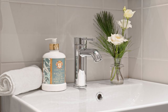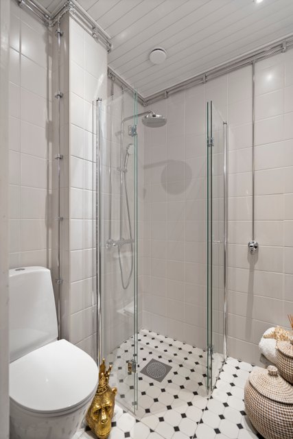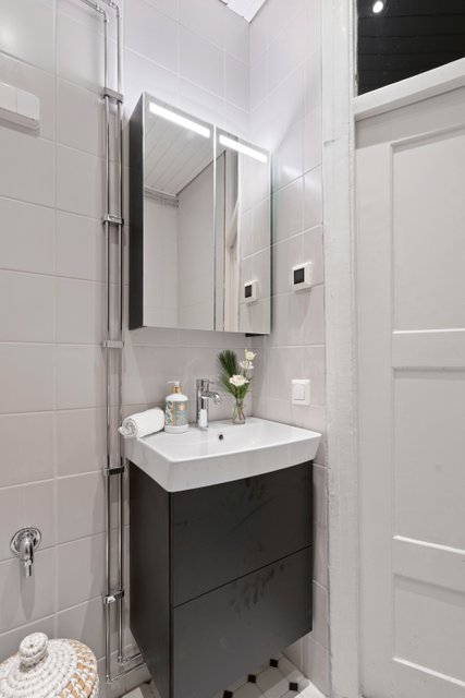 - WC-istuin, suihku, suihkuseinä, pesukoneliitäntä, peilikaappi, pesuallas, ja bidee-suihku