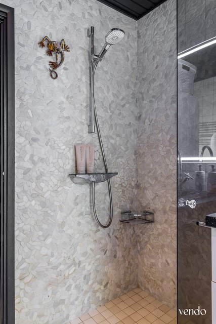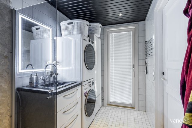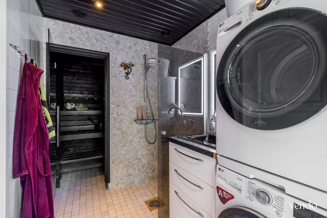 - Suihku, suihkuseinä, kuivausrumpu, pesukone, peili, ja pesuallas