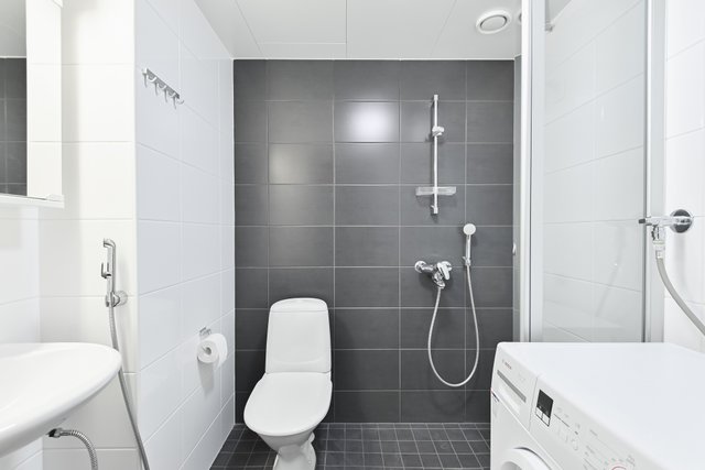 - WC-istuin, pesukoneliitäntä, peilikaappi, allaskaappi, pesuallas, bidee-suihku, ja suihkuseinä