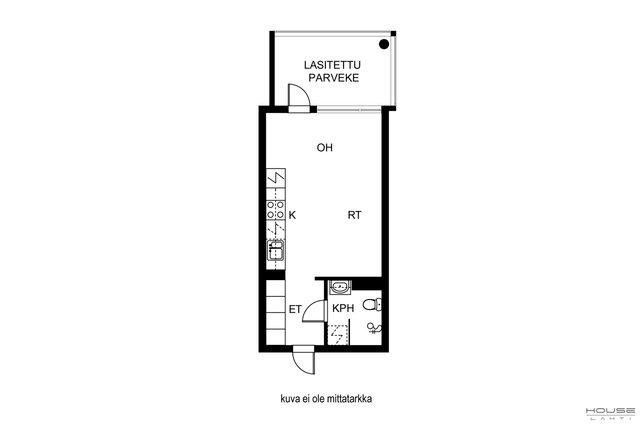 Yksiön pohjaratkaisu on toimiva, keittiön ja olohuoneen yhdistäminen antaa sopivasti tilaa yksinasuvalle ja lasitettu parveke tarjoaa kesällä lisätilaa nauttia auringosta.