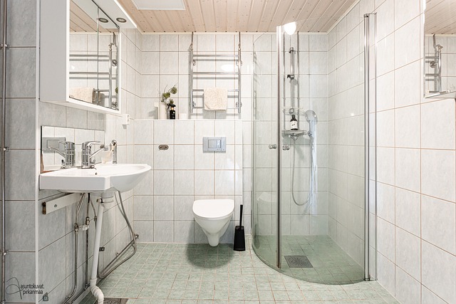 - Suihkuseinä, peilikaappi, suihku, wc-istuin, pesukoneliitäntä, ja lattialämmitys