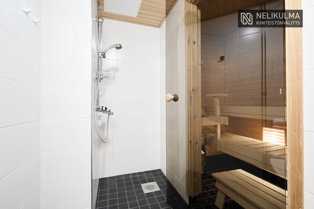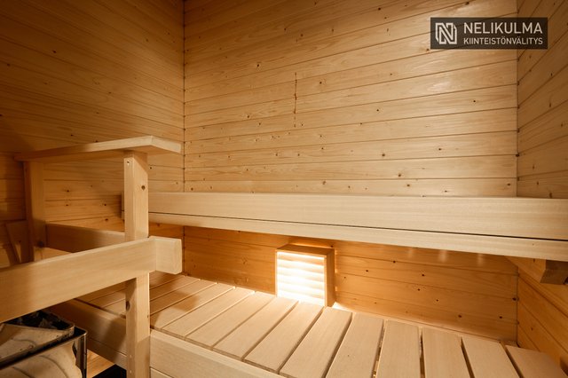 Oma sauna ja lasitettu parveke tekevät tästä kodista erityisen viihtyisän.