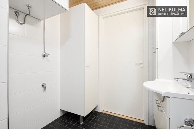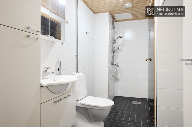 - WC-istuin, suihku, suihkuseinä, pesukoneliitäntä, lattialämmitys, peilikaappi, pesuallas, ja bidee-suihku