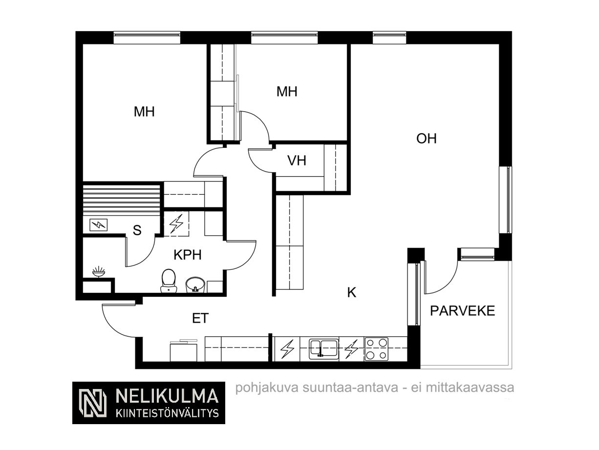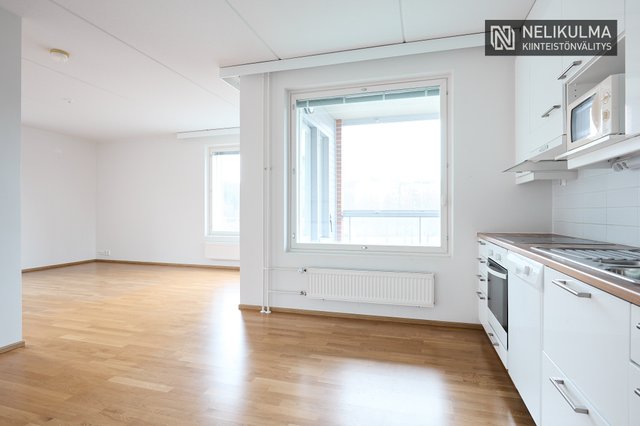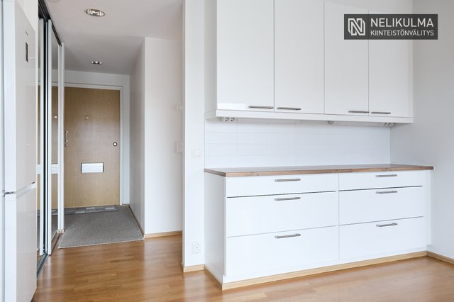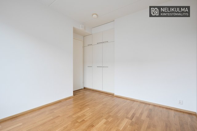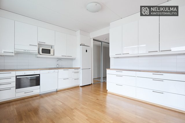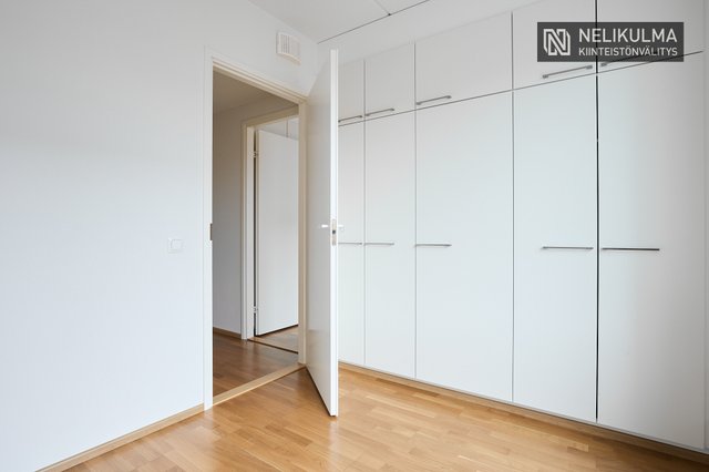 Pohjaratkaisu on todella toimiva, asunnossa on tilava keittiö, jossa hyvin kaappi- ja laskutilaa. Keittiö yhdistyy saumattomasti olohuoneeseen ja makuuhuoneet ovat omassa rauhassaan. Myös säilytystilaa on mukavasti vaatehuoneessa ja kaapistoissa.