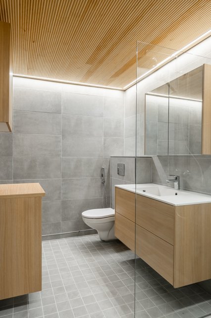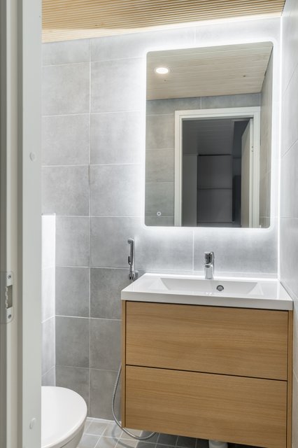 - WC-istuin, suihku, suihkuseinä, pesukoneliitäntä, lattialämmitys, peilikaappi, pesuallas, allaskaappi, ja bidee-suihku