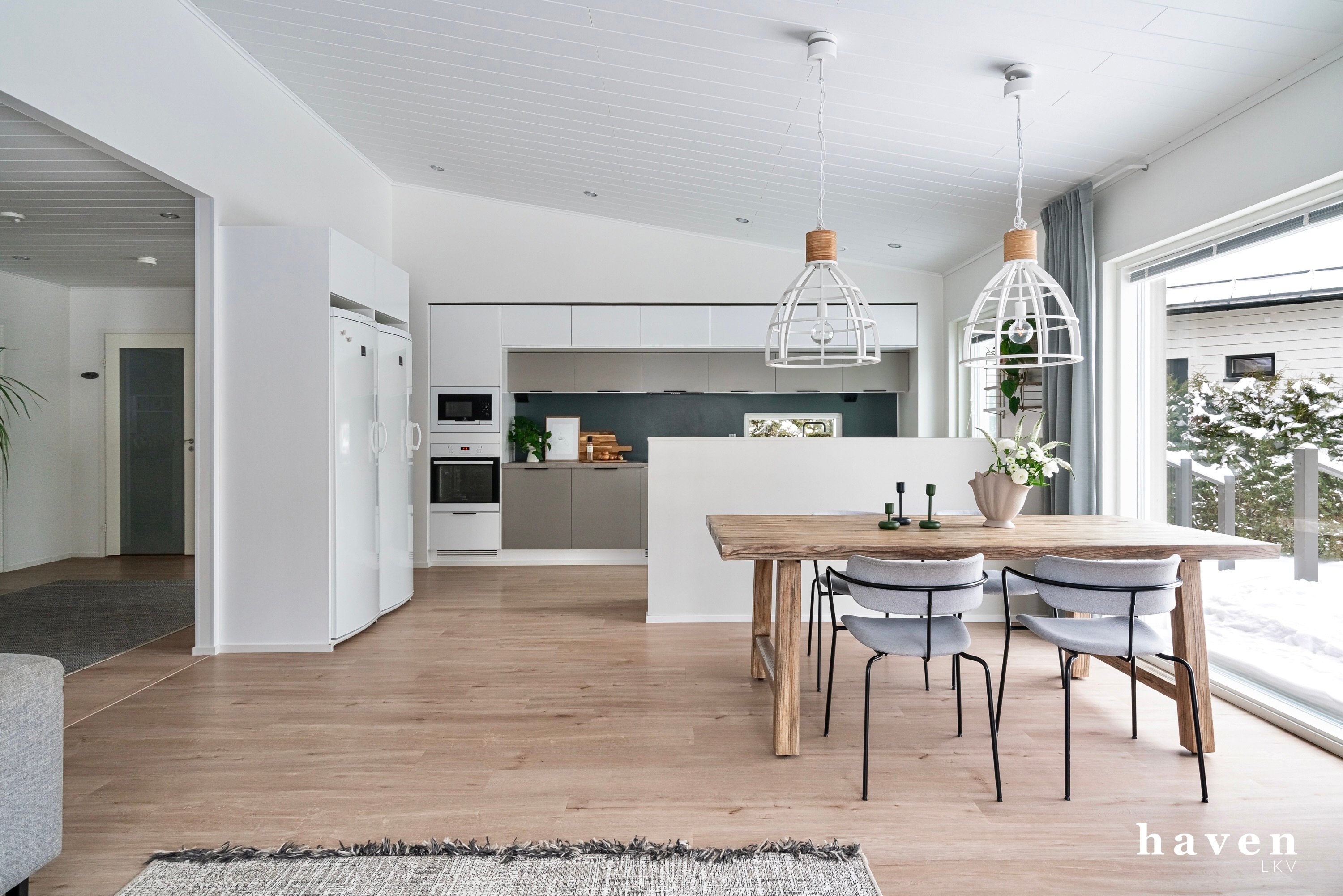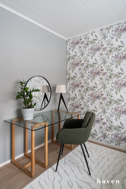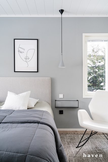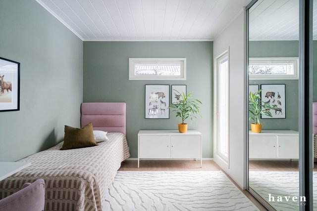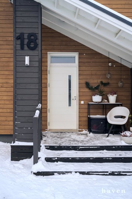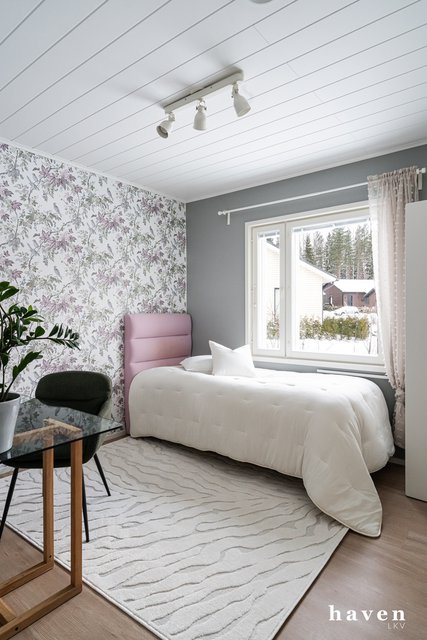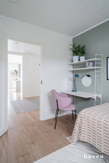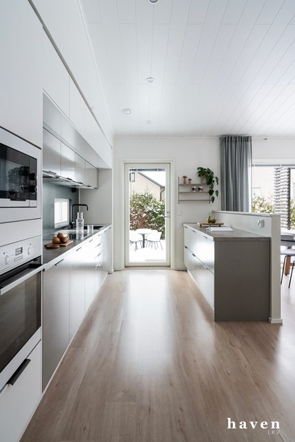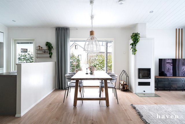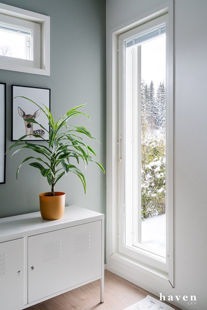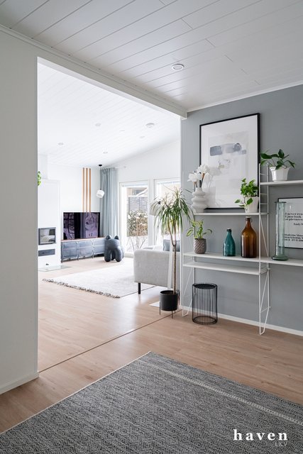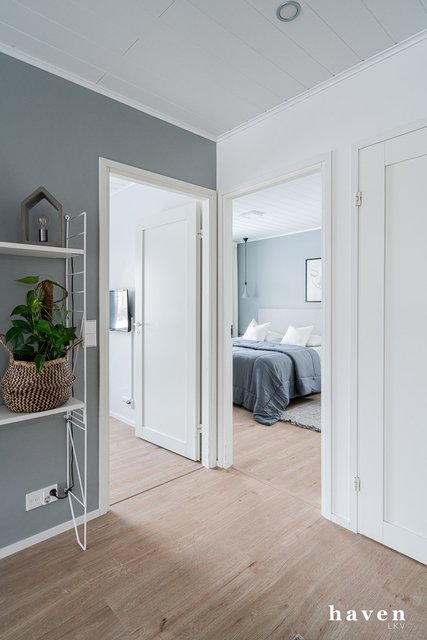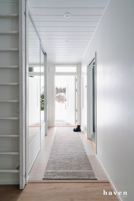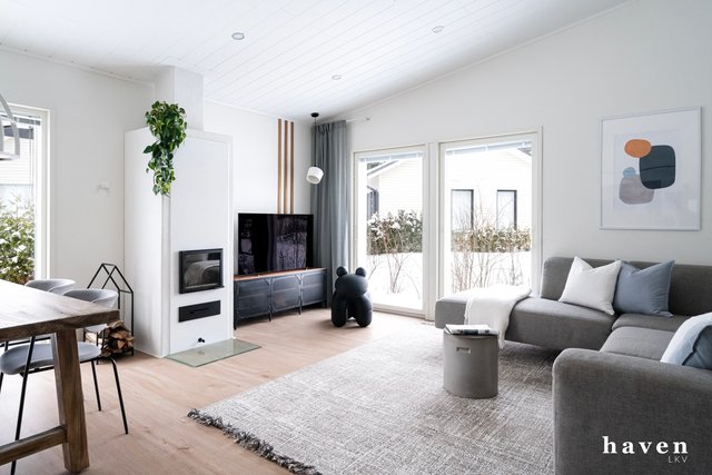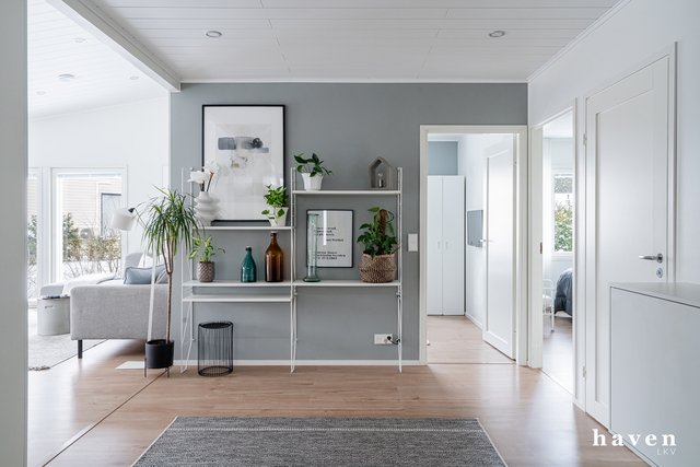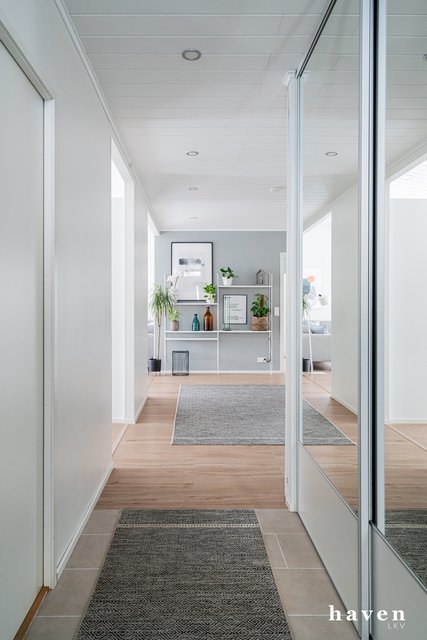 Kaunis värimaailma valkoista ja puuterisia sävyjä sekä lämmintä puuta. Säilytystilaa ja ikkunapinta-alaa on runsaasti, samoin väljyyttä niin eteis- ja kylpytiloissa kuin oleskelutiloissakin.