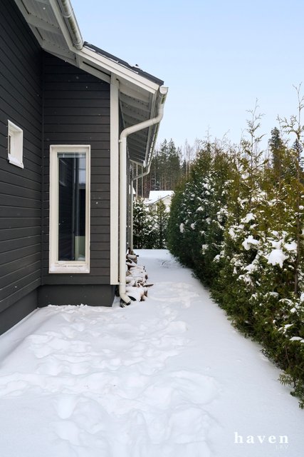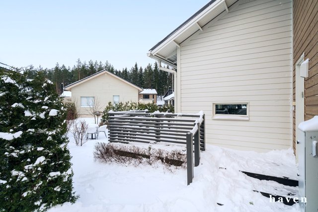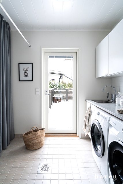 - Vesipiste, kaappi- ja laskutilaa, pesukoneliitäntä ja oma paikka pesukoneelle sekä kuivausrummulle. Uloskäynti terassille ja takapihalle.