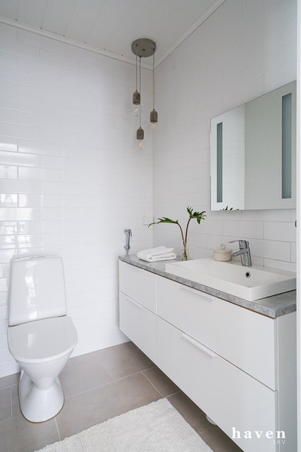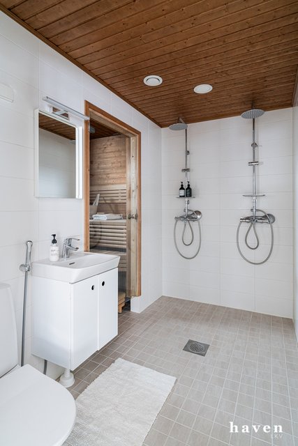 - Tilava laatoitettu kylpyhuone lattialämmityksellä. Tuplasadesuihkut, peili, allaskaappi, wc.