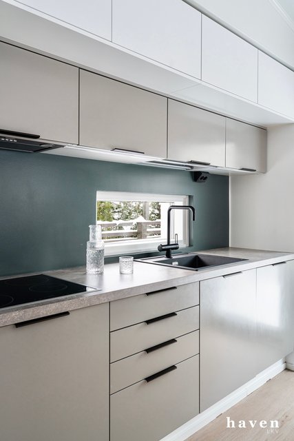 - Korkea jääkaappi, korkea pakastin, induktiokeittotaso, erillisuuni, integroitu mikroaaltouuni, liesituuletin (hormi), astianpesukone.