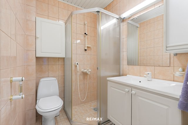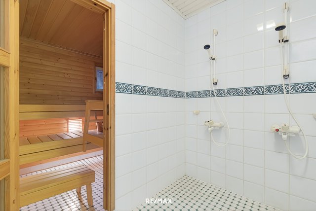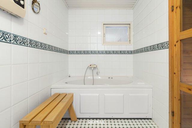 - Kaksi kylpyhuonetta, joista toisessa suihku, wc-istuin, suihkukaappi, peili, allaskaappi, seinäkaappi. Seinät ja lattia laattaa. Lattialämmitys. Saunaosaston kylpyhuoneessa poreamme, kaksi suihkua. Seinät ja lattia laatoitettu, lattialämmitys.