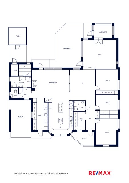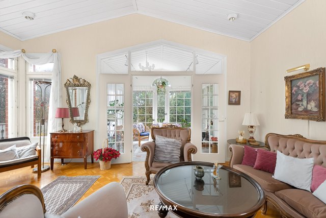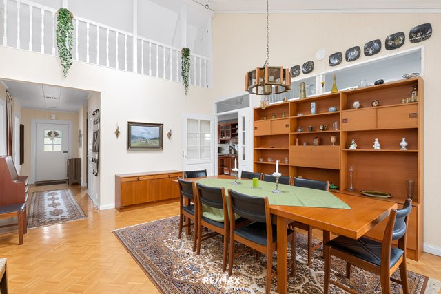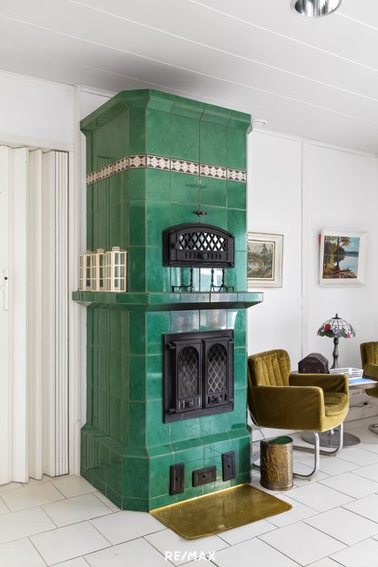 - Sisääntulon yhteydessä pieni työtila/työhuone. Erillinen iso ruokailutila, jossa huonekorkeus n. 4m. Keittiön yhteydessä arkiolohuone, jossa kaunis takka/leivinuuni. Olohuoneen päässä viihtyisä viherhuone/lasikuisti, josta ovi ulos piha-alueelle.
