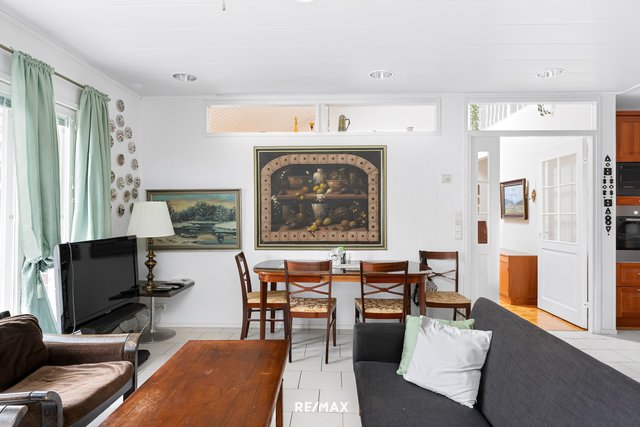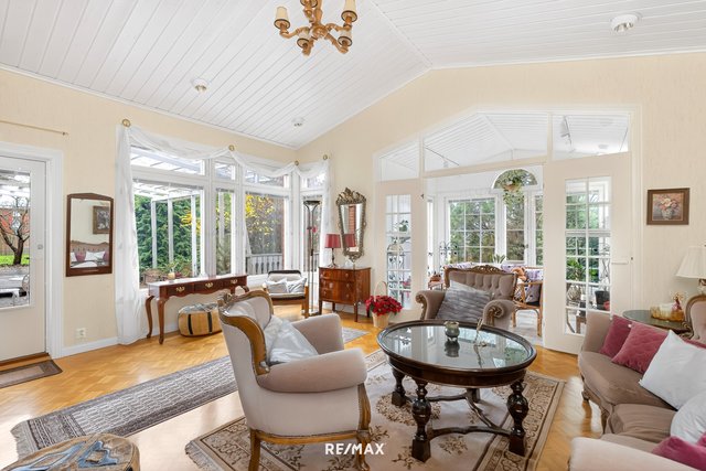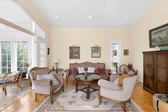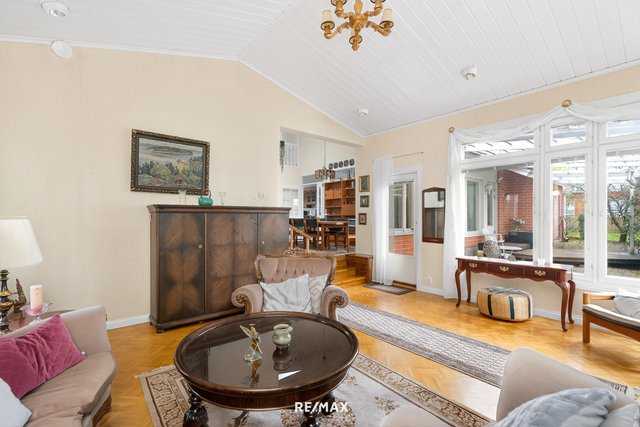 - Valoisa ja korkea tila, josta käynti ulos terassille sekä erilliselle lasikuistille. Seinät tapetoitu, lattia parkettia.
