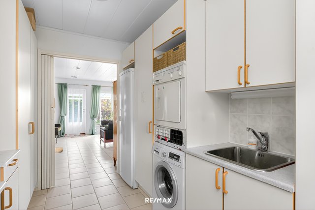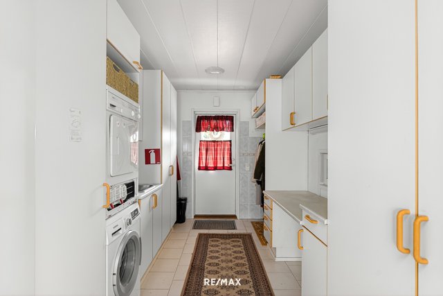- Keittiön vieressä tilava kodinhoitohuone, josta käynti ulos. Oven edessä kurasyöppö (lattiakaivo) ja suihku. Kodinhoitohuoneessa pesukoneliitäntä, tilaa pesutornille, runsaasti kaapistoja ja työtasoa, integroitu silityslauta, naulakko. Lattia laatoitettu, lattialämmitys. Kodinhoitohuoneessa luukku kellaritilaan.