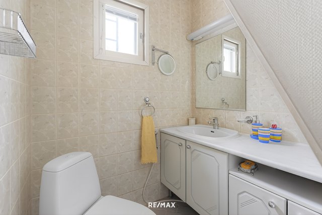 Asunnossa on kaksi kylpyhuonetta ja sauna sekä erillinen wc. Säilytystilaa on kaapistoissa ja käyttöullakolla sekä autotallissa ja ulkovarastossa.