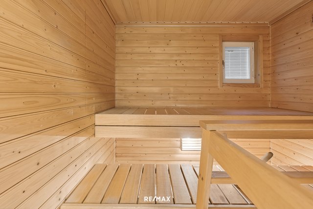 - Ikkunallinen sauna, jossa sähkökiuas. Lattia laatoitettu, seinät paneelia.