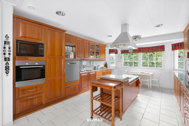 - Tilava keittiö, jossa runsaasti kaapistoja. Kalusteissa kokopuuovet, työtasot graniittia. Erillinen uuni, mikroaaltouuni, keraaminen liesitaso, korkea jääkaappi, astianpesukone. Keittiön lattia laattaa, keittiössä erkkeri-ikkuna.