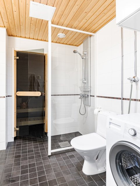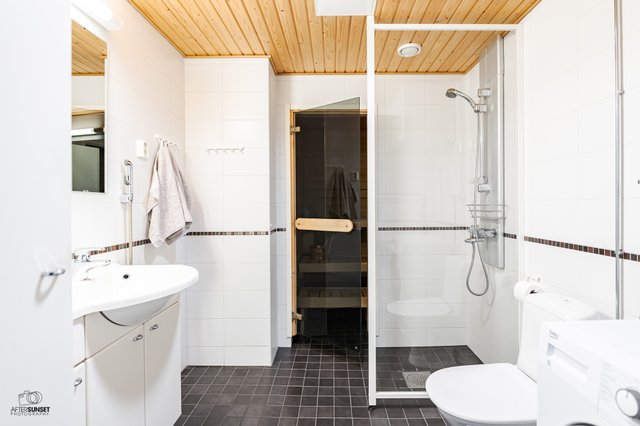 - Varustus: pesukoneliitäntä, suihku, suihkuseinä, lattialämmitys, wc-istuin, peili, allaskaappi. Tila laatoitettu kauttaaltaan.