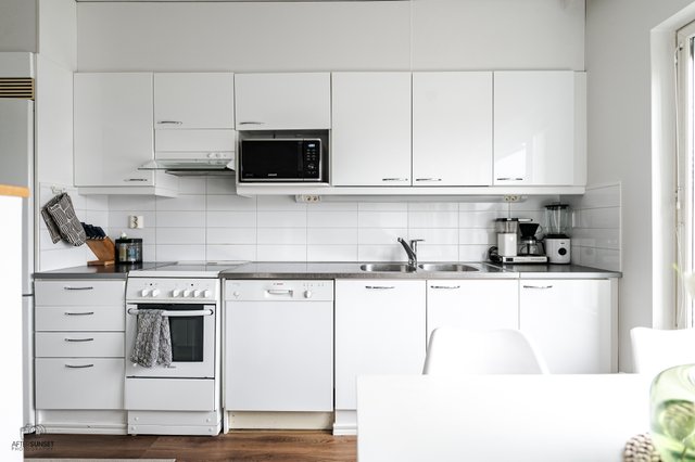 - Varustus: keraaminen liesi, liesituuletin, astianpesukone, jääkaappi/pakastin, vinyylilattia.