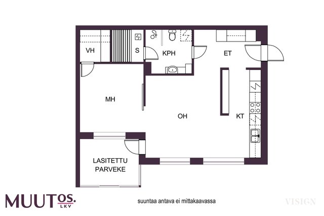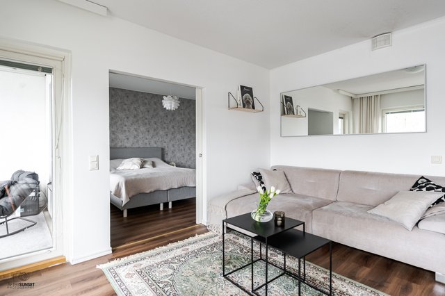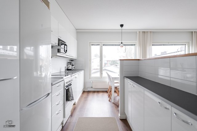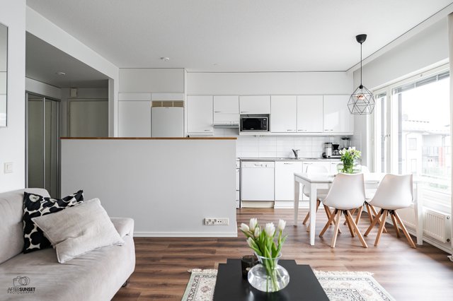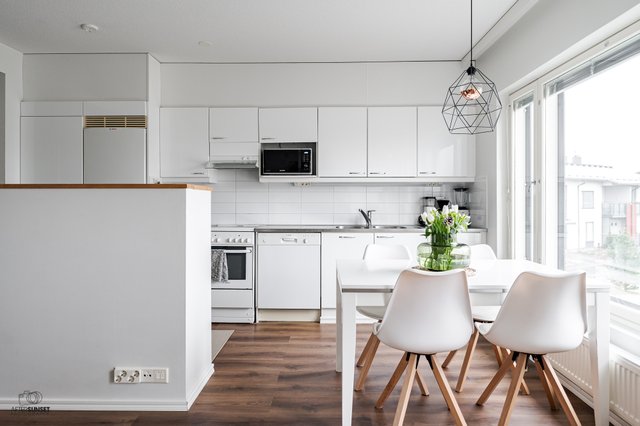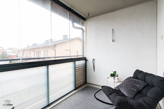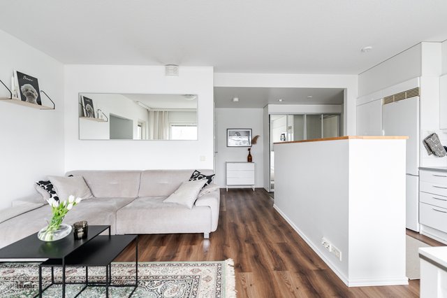 Asunnon parhaita puolia on erinomainen pohjaratkaisu. Keittiö on monien toiveiden mukaan avonainen ja yhdistyy saumattomasti olohuoneeseen, joten ajanvietto ystävien kanssa on nautinnollista myös kokkailujen lomassa. Keittiöstä löytyy saareke, joka on erinomainen apu laskutilassa ja visuaalisesti samalla jakaa isoa tilaa. Kylpyhuone on nykytapaan tilava ja oma sauna on aina kova sana, varsinkin nyt viileillä ilmoilla. Parveke on valmiiksi lasitettu, joten vilvoittelu saunan jälkeen onnistuu vähän kurjemmallakin kelillä.