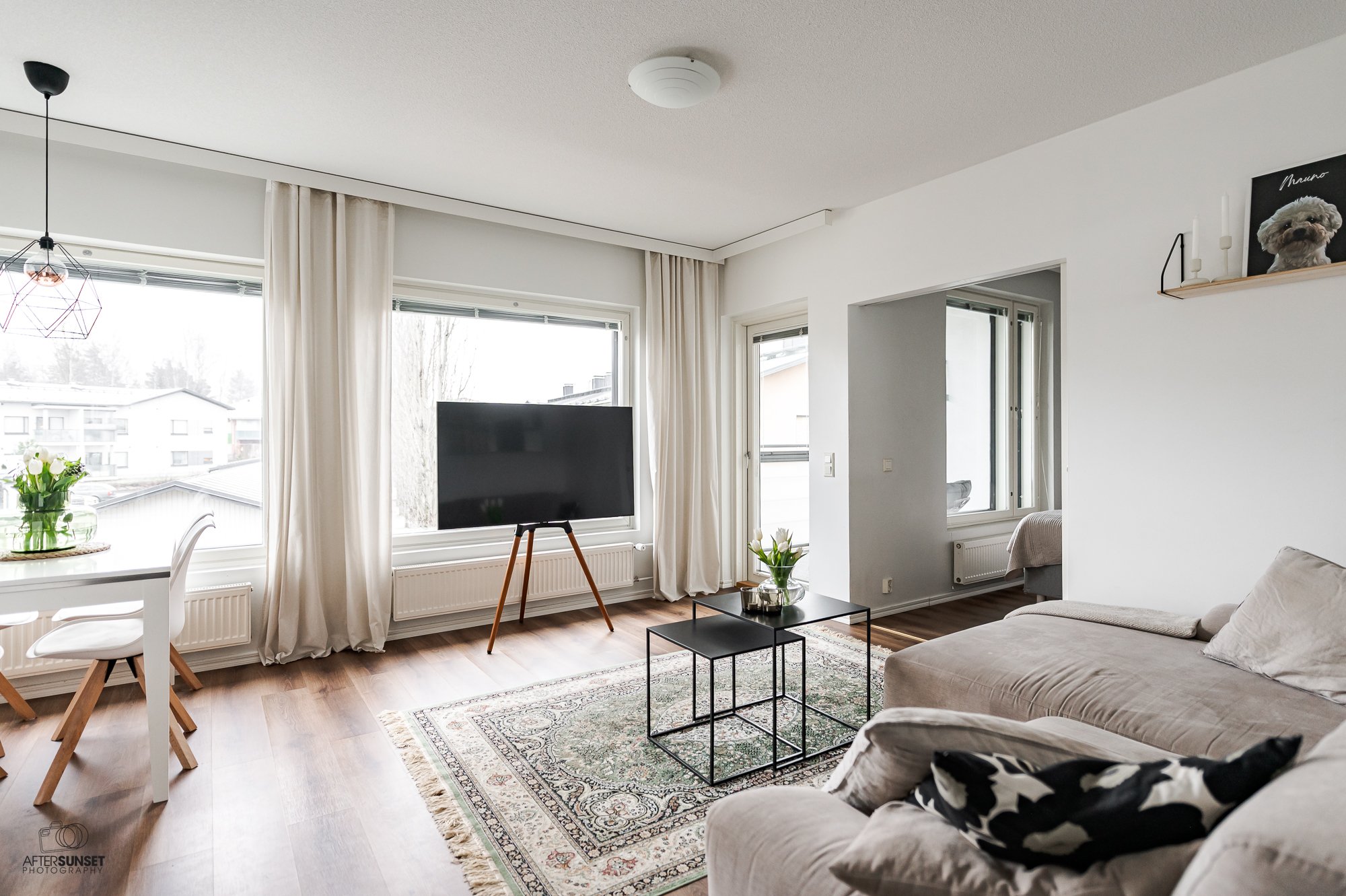 - Avara olohuone, josta kulku lasitetulle parvekkeelle. Vinyylilattia.