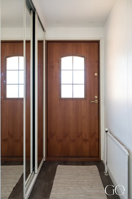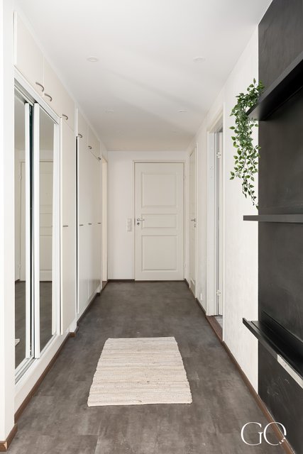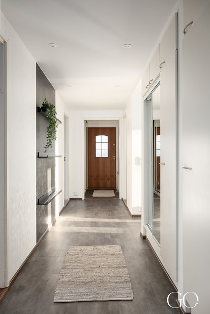 - Käytävässä kaapistot, peiliovet, hyllyt ja vinyylilattia. Takkahuone, jossa on parkettilattia.