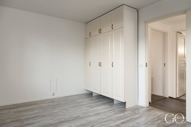 - Kaksi suurta makuuhuonetta, joissa toisessa on kaapistot. Seinät maalattu ja parkeettilattia.