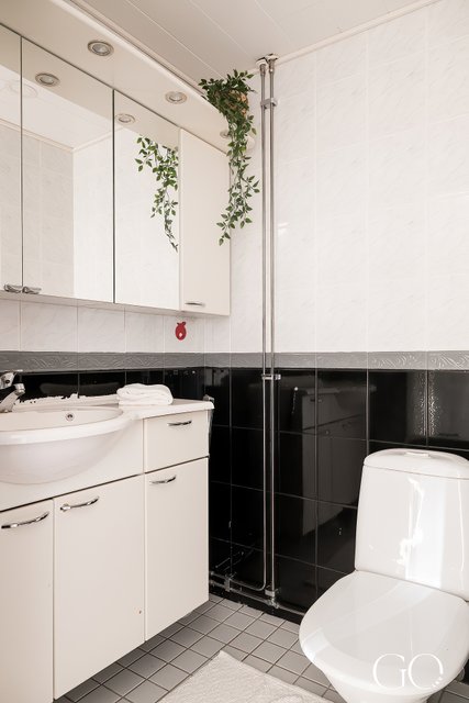 - Suuri kylpyhuone, jossa on peilikaapit, kaapistot, pesuallas, hana ja 2 x rättipatteri, pesukoneliitäntä ja suihku. Laattalattia ja kaakeliseinä.