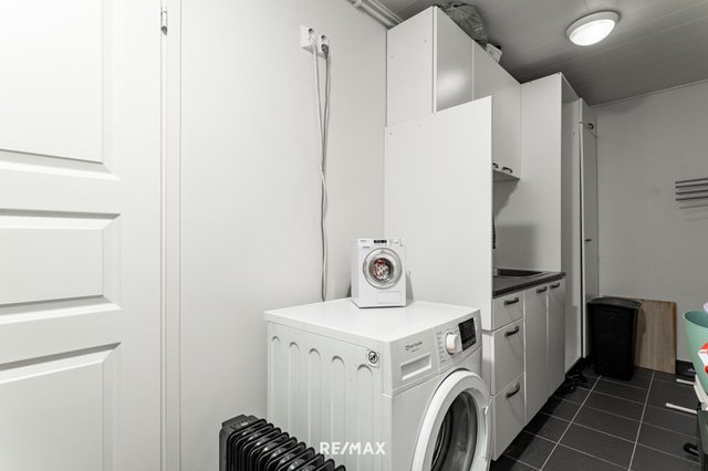 - Pesukoneliitäntä, pöytätaso, tila pesutornille, pesuallas, ja pyykkikaapit