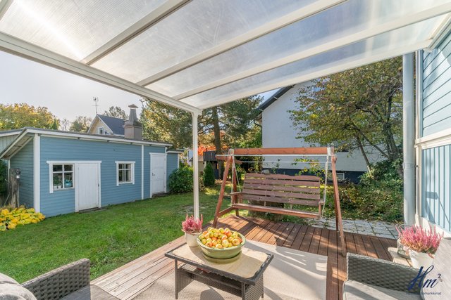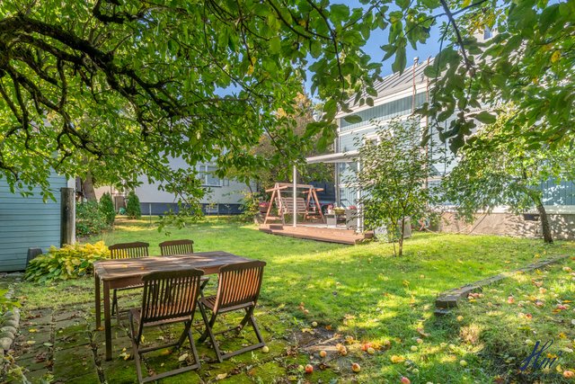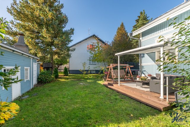 Oma, vehreä puutarhatontti on pääosin nurmikkoa, ja pihapiiristä löytyy omenapuita, kirsikka- ja luumupuita sekä katettu terassi, joka kutsuu viettämään aikaa ulkona.