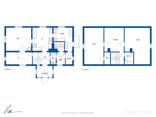 Pohjaratkaisu on käytännöllinen. Yläkerrassa sijaitsevat kaksi tilavaa makuuhuonetta, aulatila ja erillinen wc. Alakerrasta löytyvät kuisti, eteinen, toinen wc, pesutilat ja sauna, sekä kodinhoitohuone, josta on myös käynti ulos. Lisäksi alakerrassa on yksi makuuhuone, tunnelmallinen olohuone kakluunilla sekä keittiö, jossa on perinteinen puuhella.