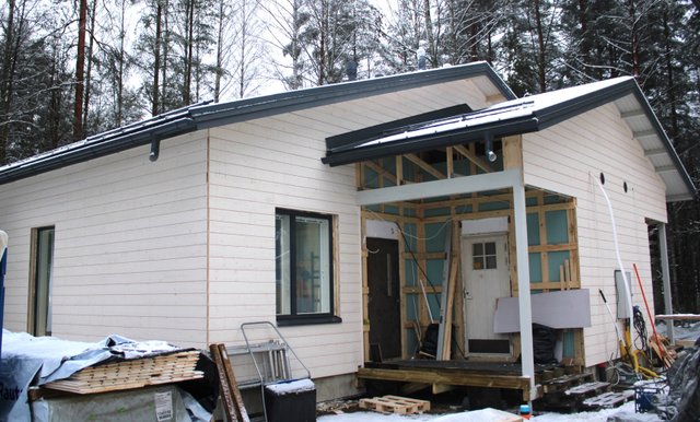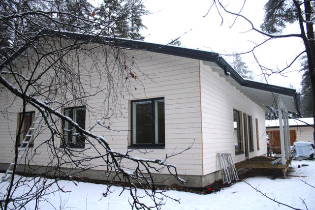 Huoneisto modernin tyylikäs kokonaisuus, laadukkaat materiaalit, ulkovuori verhous 28mm kestää tuulta ja tuiskua, seinät puhallusvillaeristein, harjakatto lukkosauma peltikatteella.