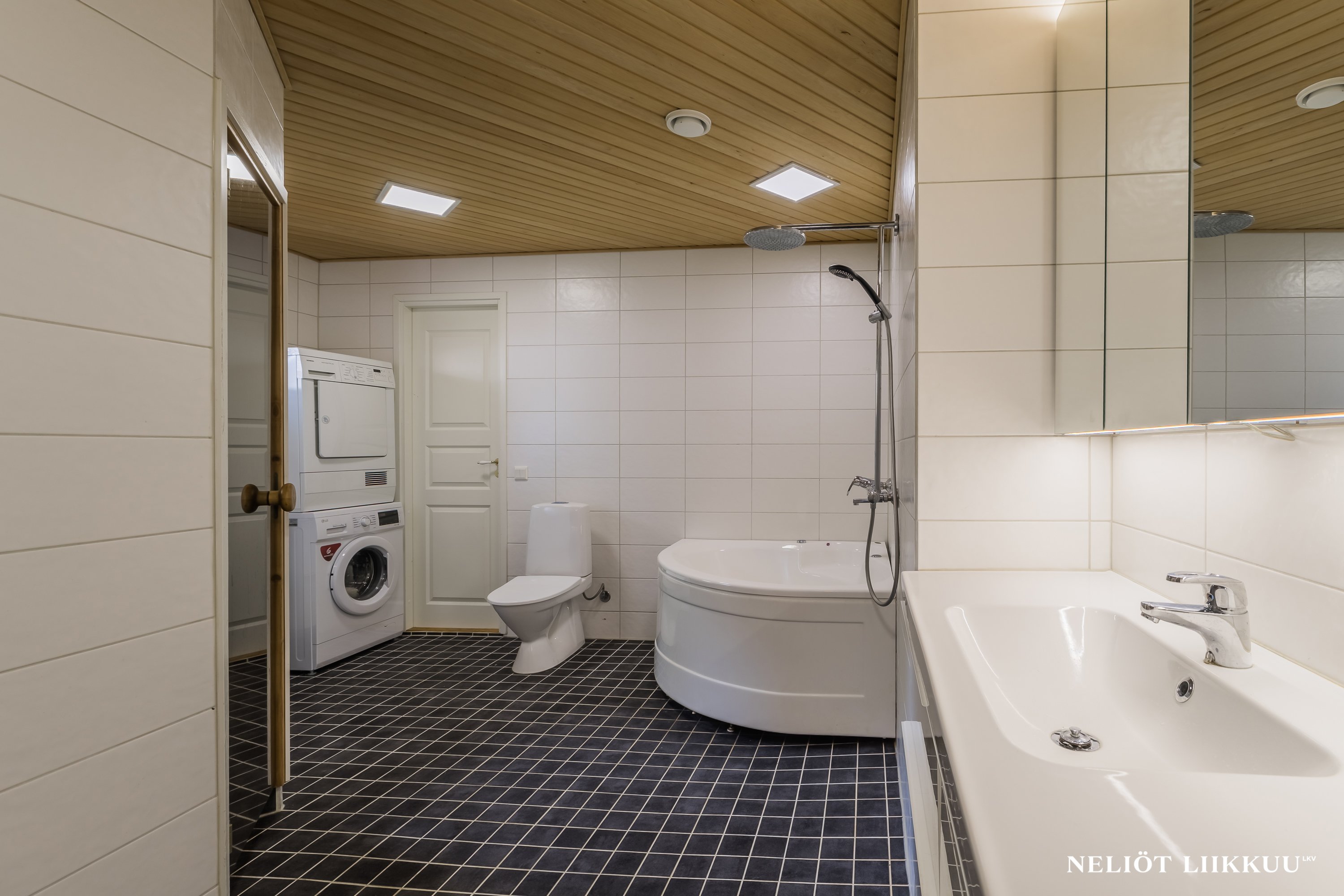 - Poreamme, suihku, wc-istuin, pesukoneliitäntä, allaskaappi, pesuallas, ja lattialämmitys