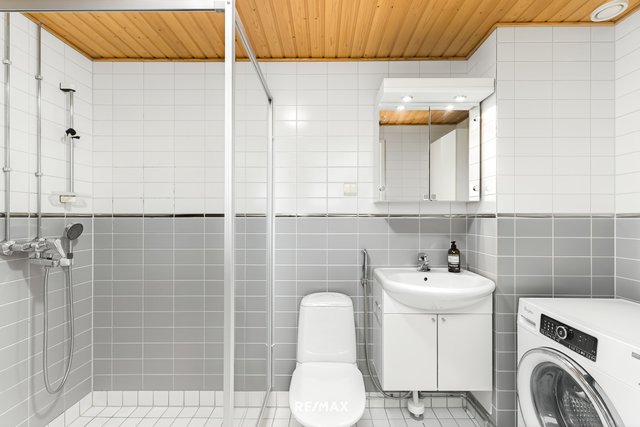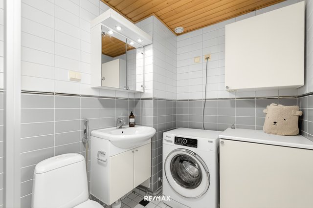 - WC-istuin, suihku, suihkuseinä, pesukoneliitäntä, lattialämmitys, peilikaappi (lisäksi 2 kaapistoa), allaskaappi, ja bidee-suihku