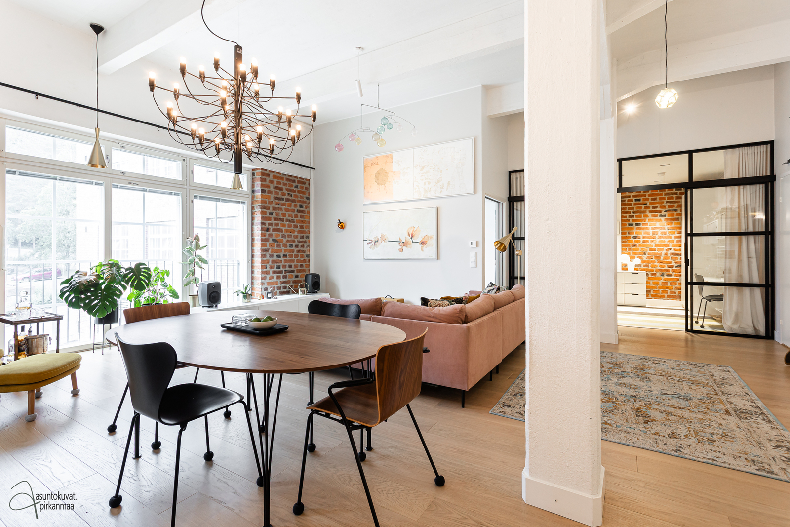 Mieletön huonekorkeus, alkuperäiset tiiliseinät sekä nykyaikainen asuinmukavuus kuten digitaalisesti ohjattu jäähdytysjärjestelmä takaavat viihtyvyyden tässä upeassa loft-asunnossa.