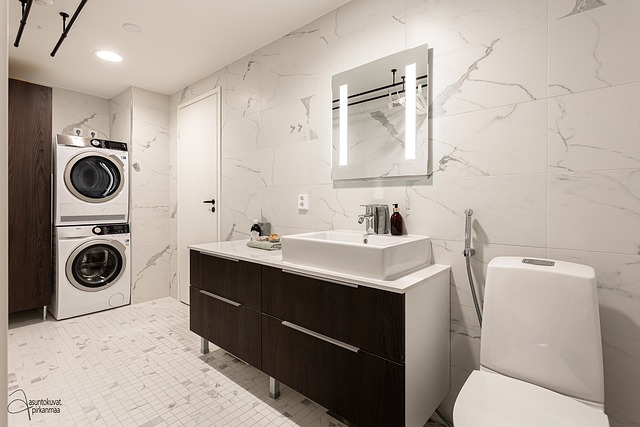 - Pyykkikaappi, tila pesutornille, pk-liitäntä, lavuaari, allaskaapisto, työtaso, valopeili, vaatetanko, wc-istuin, bidee-suihku. Laatoitettu seinät ja lattia.