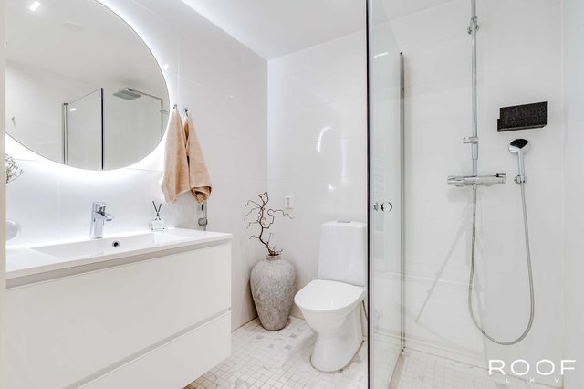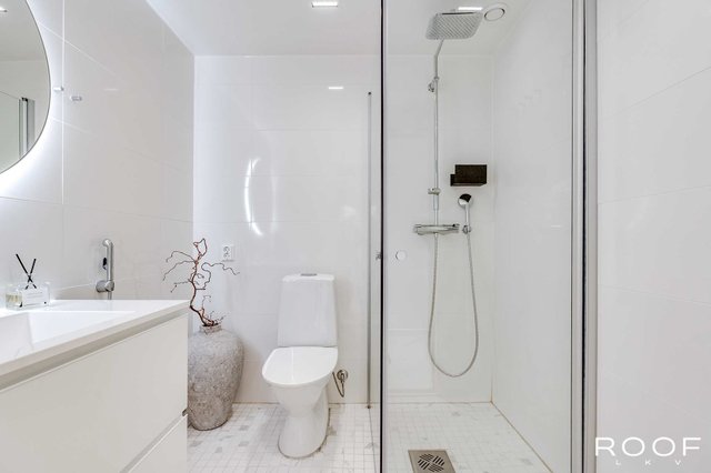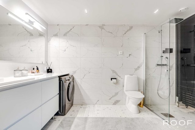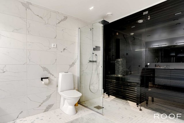 - WC-istuin, suihku, suihkuseinä, pesukoneliitäntä, lattialämmitys, ja kylpyhuonekaapisto