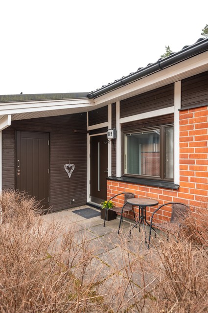 - Talon sisääntulon yhteydessä kiveyksin huoliteltu patio. Takapihalla puuverhoiltu terassialue.