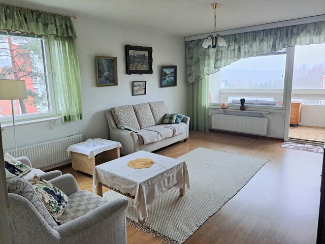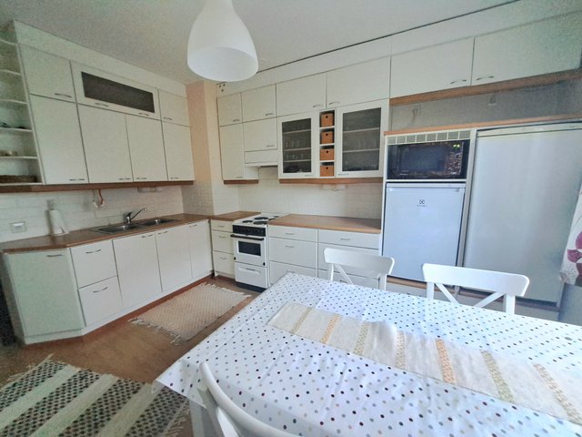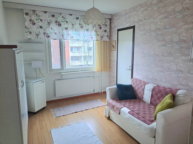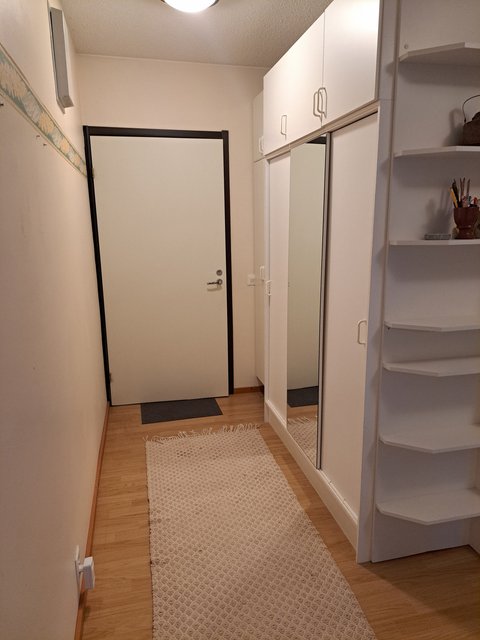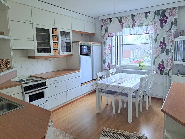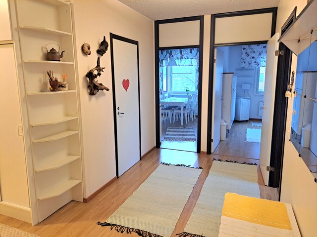 Keittiö on käytännöllinen ja varusteltu kaikella tarvittavalla, ja kylpyhuone on laatoitettu. Laminaattilattiat ja tapetoidut sekä maalatut seinät luovat viihtyisän ja kodikkaan tunnelman. Asunto sijaitsee toisessa kerroksessa, ja talossa on hissi, mikä helpottaa arkea.