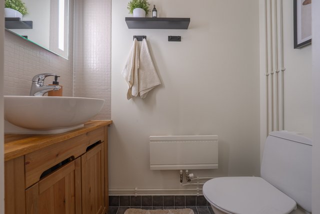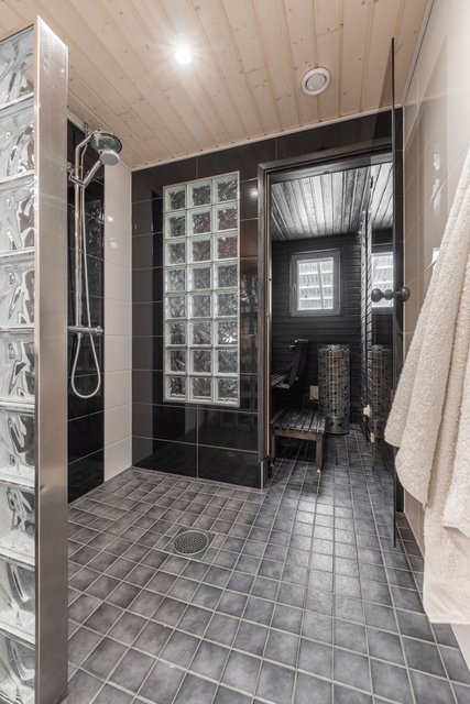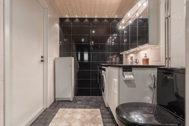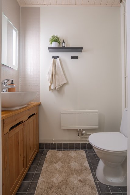 - WC-istuin, suihku, pesukoneliitäntä, peilikaappi, ja allaskaappi
