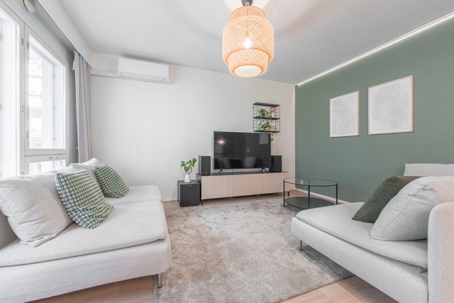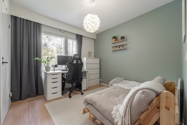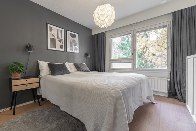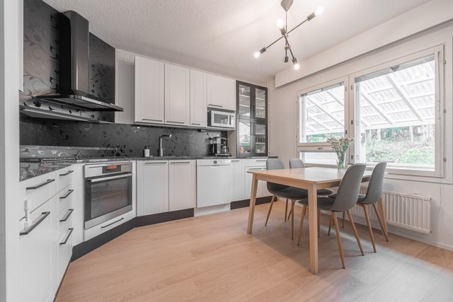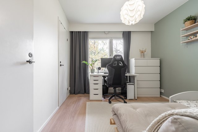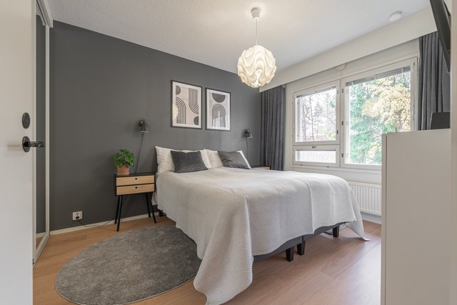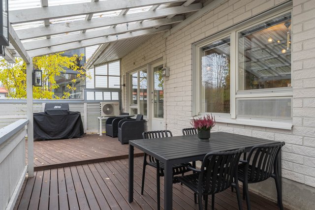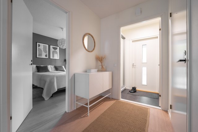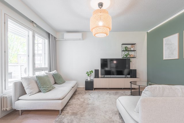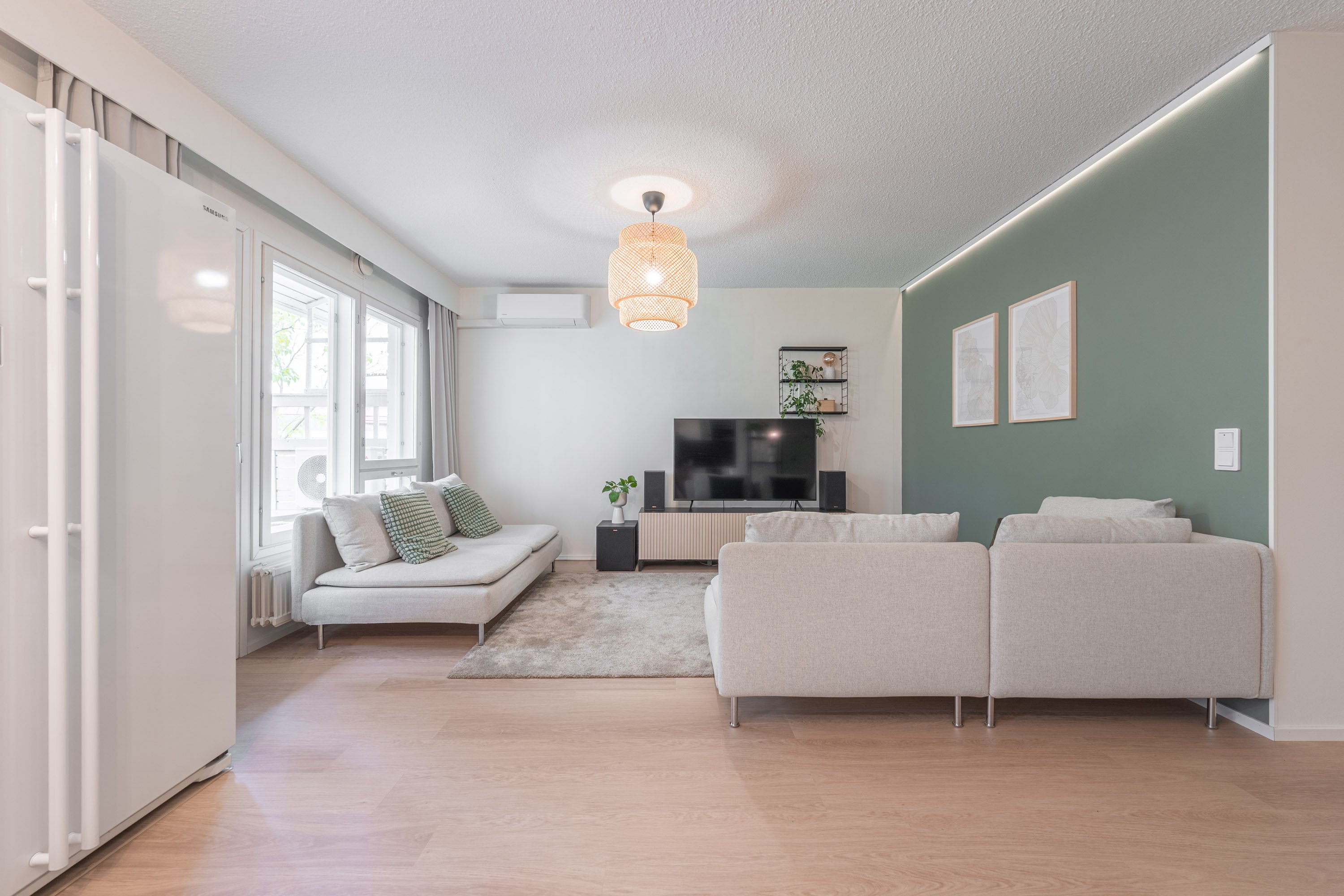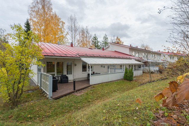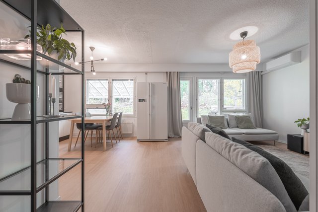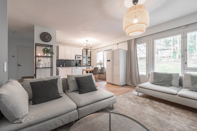 1-tasoisessa remontoidussa päätyhuoneistossa on kaksi makuuhuonetta, tilava olohuone ja moderni keittiö, jossa on kaikki tarvittavat kodinkoneet. Kylpyhuone ja sauna ovat remontoituja ja arkea helpottaa myös erillinen wc. Värimaailma Kodissa on ihanan harmoninen ja sopii moneen makuun. Säilytystilaa löytyy makuuhuoneista tilavan vaatehuoneen sekä kaapiston ansiosta. Ulkovarasto helpottaa arkea suoraan ulko-oven vieressä. Ilmalämpöpumppu viilentää tehokkaasti kesän helteillä. Osittain katettu terassi tarjoaa mukavan paikan rentoutua ja nauttia ulkoilmasta. Takapiha rajoittuu puistometsään.