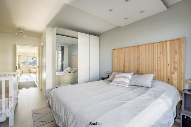 Makuuhuone on reilun kokoinen. Tilaan sopii hyvin myös työpiste, ja huoneen yhteydessä sijaitsee käytännöllinen vaatehuone.