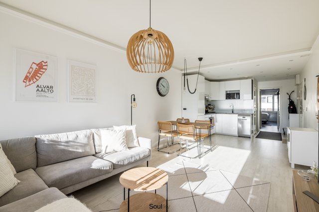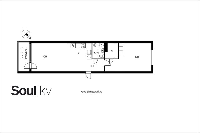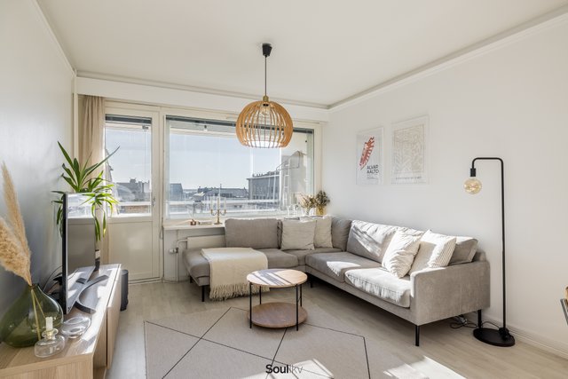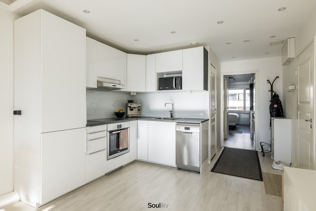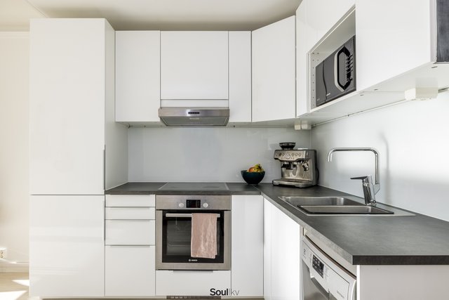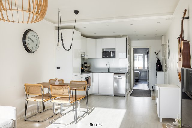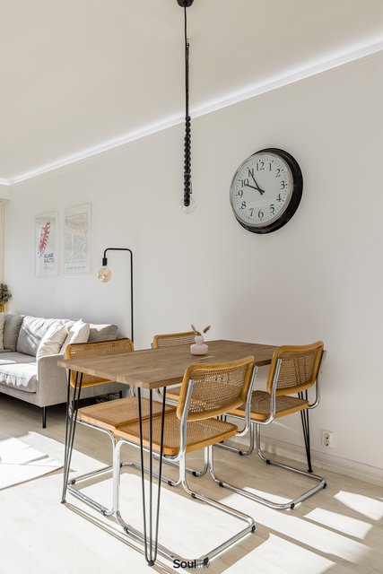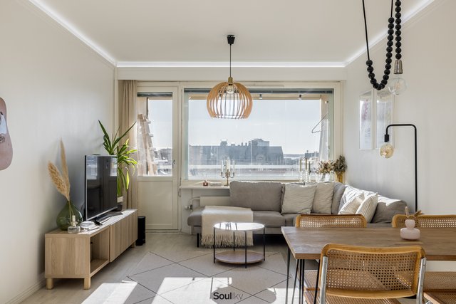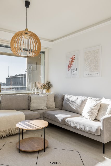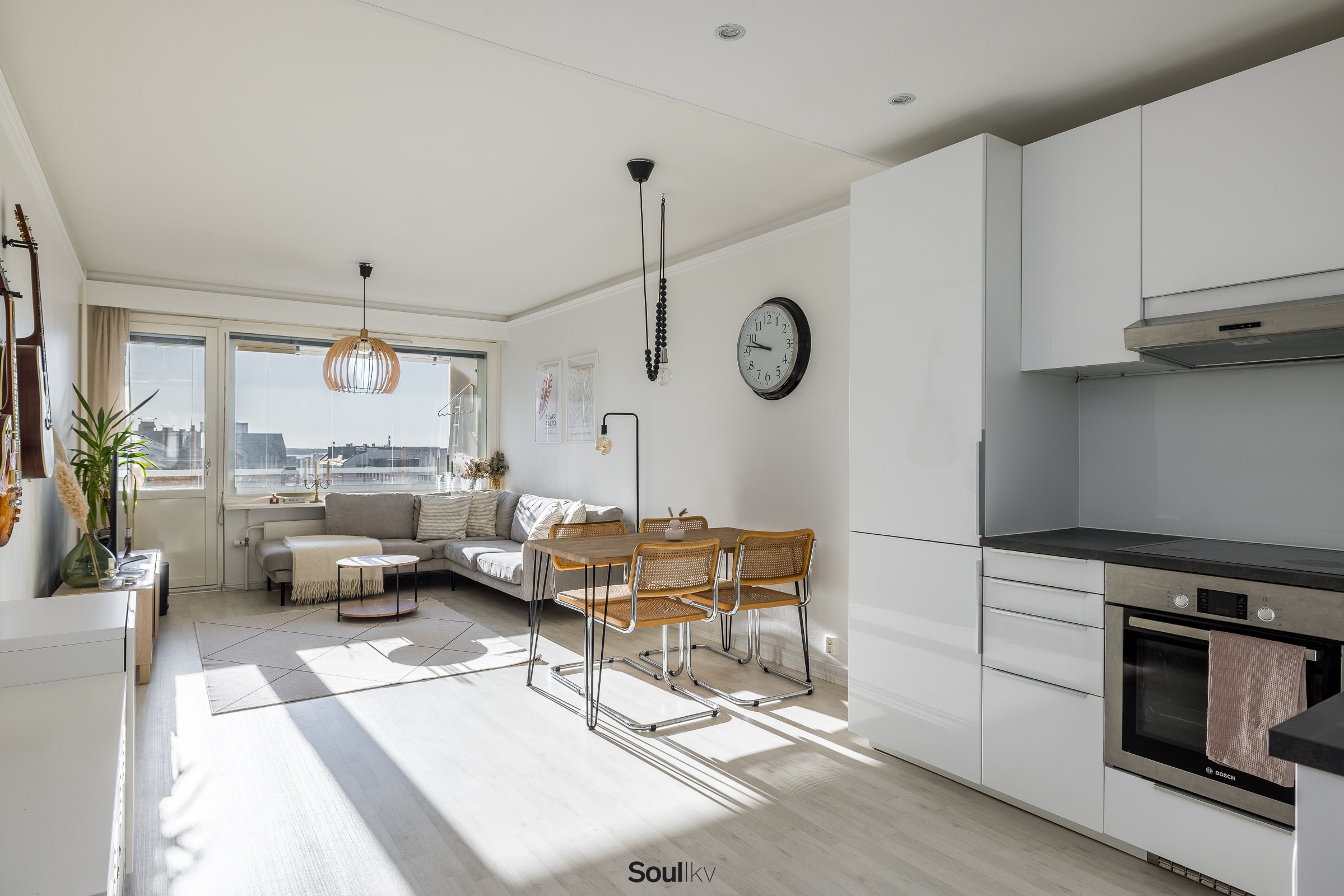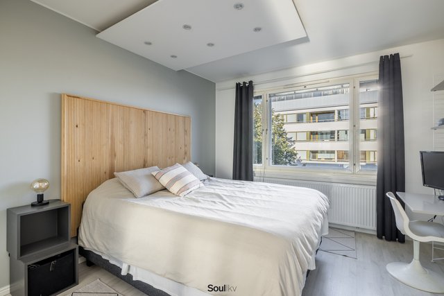 Keittiö on uusittu vaalean sävyiseksi ja varusteltu laadukkain kodinkonein. Tilavammallekin ruokailuryhmälle on selkeä paikka. Olohuone on tilava, ja se yhdistyy luontevasti keittiöön ja parvekkeelle. Olohuoneen katon rajassa kulkee säädettävä tunnelmavalaistus. Vaalea laminaattilattia jatkuu koko huoneiston läpi, luoden rauhallisen ja yhtenäisen ilmeen.