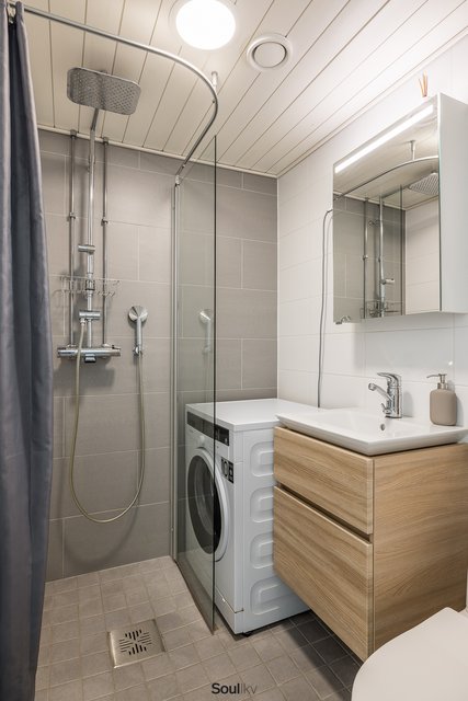 Kylpyhuone on uusittu vuonna 2019 perinteisen linjasaneerauksen yhteydessä. Tilassa on suihkuseinä, lattialämmitys ja paikka pesukoneelle.