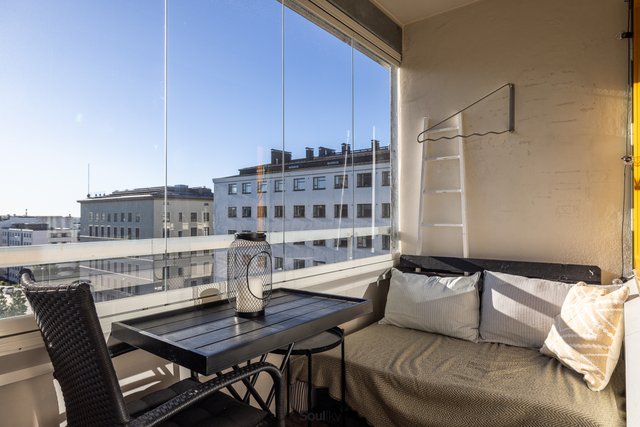 Lasitettu parveke avautuu kohti Kallion kirkkoa, tarjoten upeat näkymät jopa merelle asti. Parvekkeella saa nauttia valosta ja näkymistä alkukeväästä pitkälle syksyyn.
