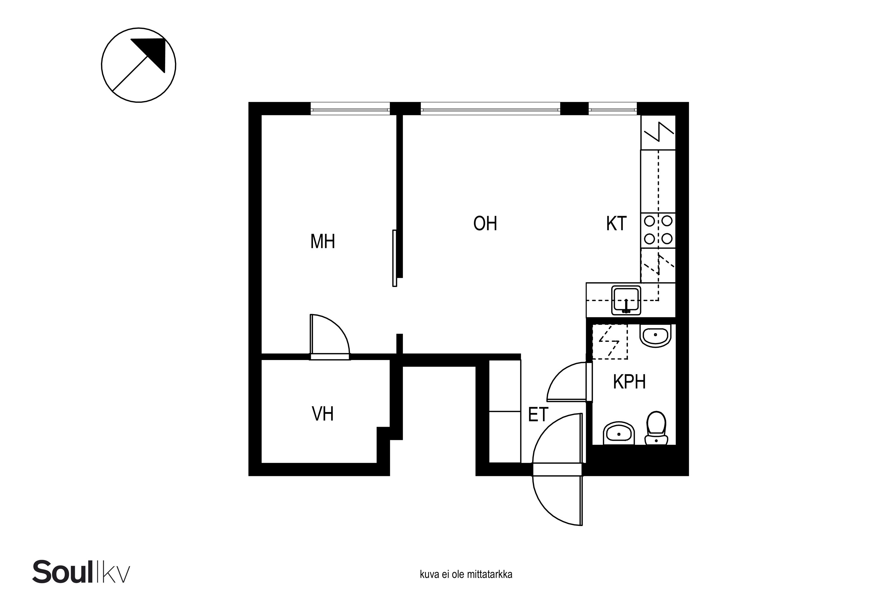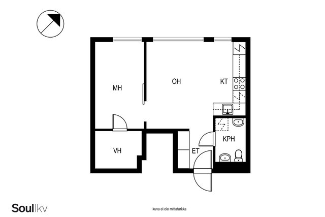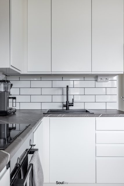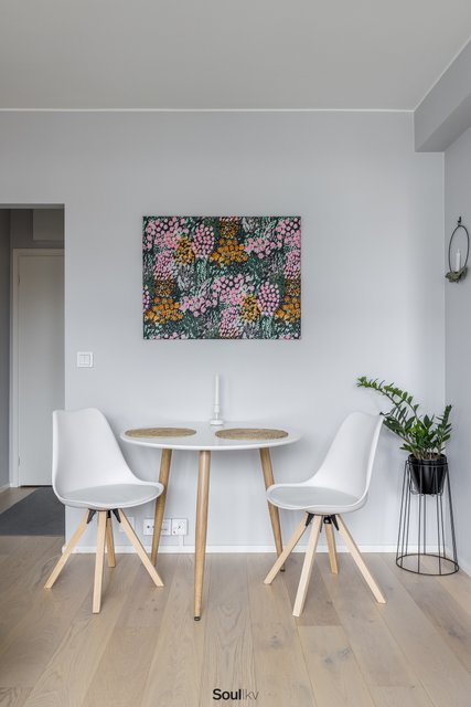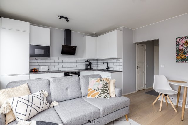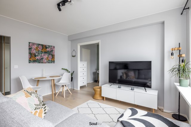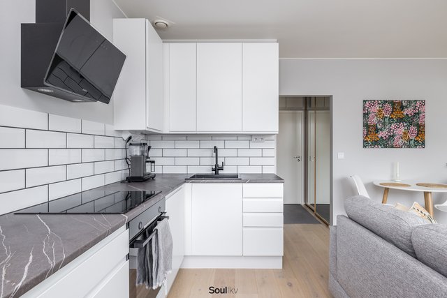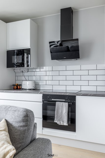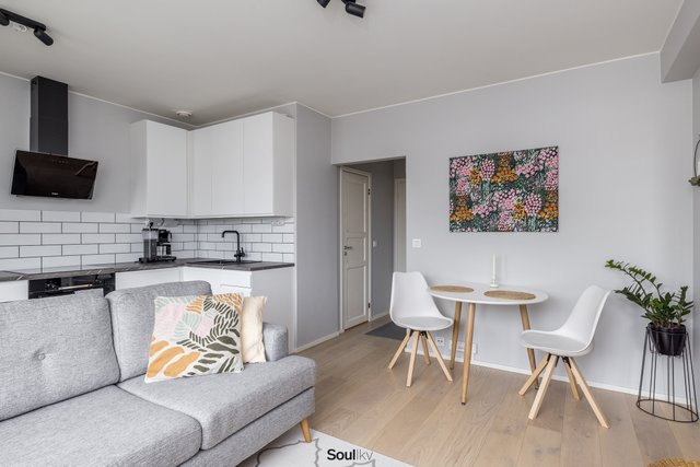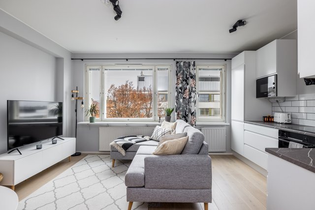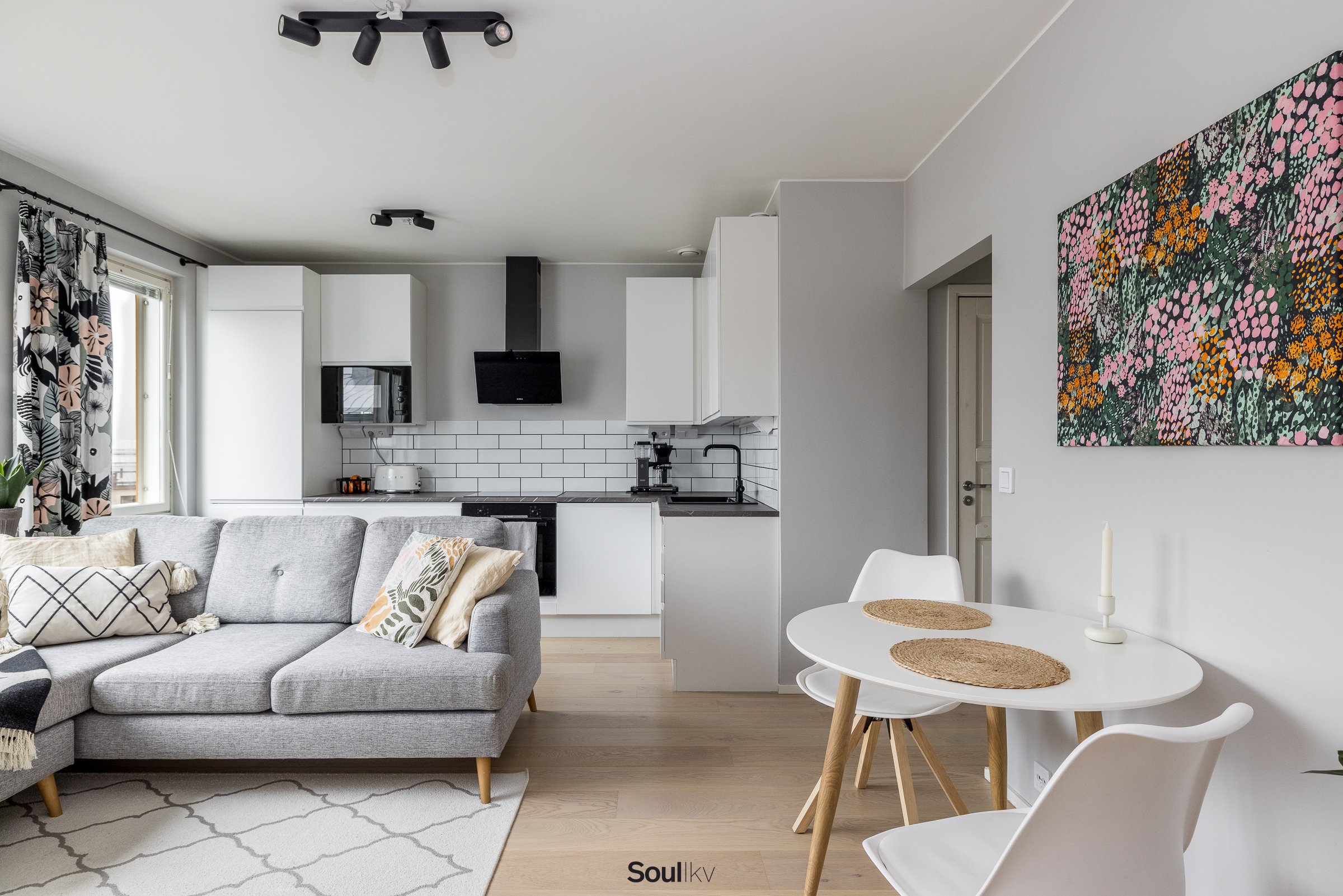 Keittiö on uusittu tyylikkäästi ja varusteltu laadukkain integroiduin kodinkonein. Olohuone yhdistyy keittiöön saumattomasti, ja tila on sisustettavissa monellakin eri tapaa. Kaunis parkettilattia jatkuu koko huoneiston läpi, luoden rauhallisen ja yhtenäisen ilmeen.