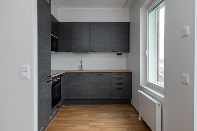 - Lattia parkettia, seinät maalattu, välitilassa levy. Integroitu jääkaappi-pakastin, integroitu mikro, integroitu astianpesukone, kiertoilmauuni, induktioliesi, liesituuletin.