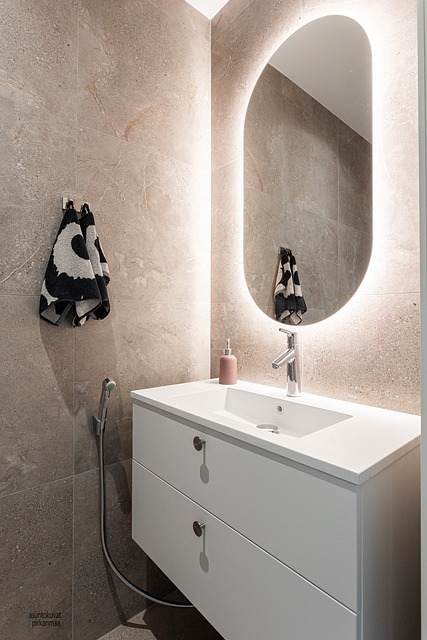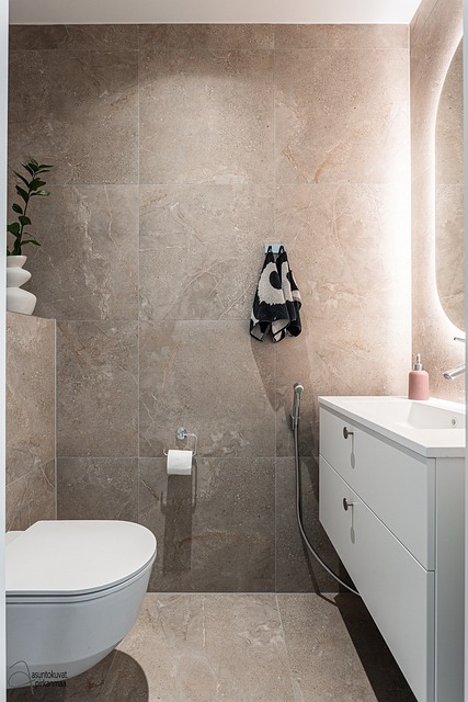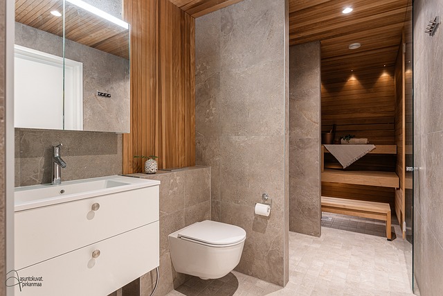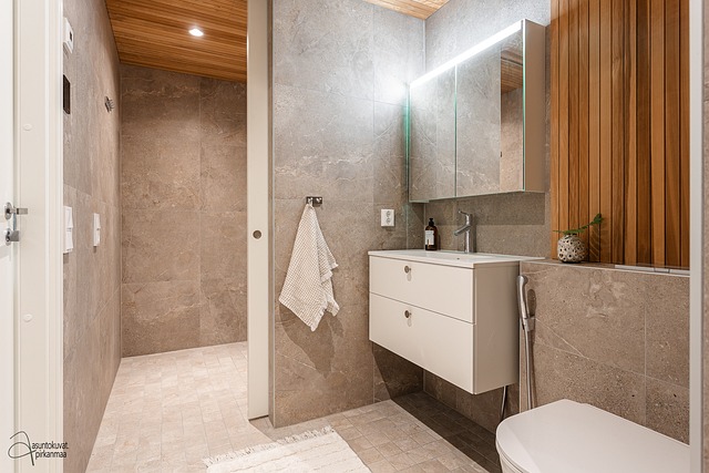 - Varustus: Suihku, seinä-WC, allaskaappi, valaistu peilikaappi, sähköinen lattialämmitys, KHH kaapistot, pesukoneliitäntä (pesutorni) ja kiinteät himmennettävät valaisimet. Varustus: Lattiapinnat Pukkilan 10x10 laatta. Seinäpinnat Pukkilan 60x60 laatta ja tehostepaneelina lämpökäsitelty haapa 15x90.